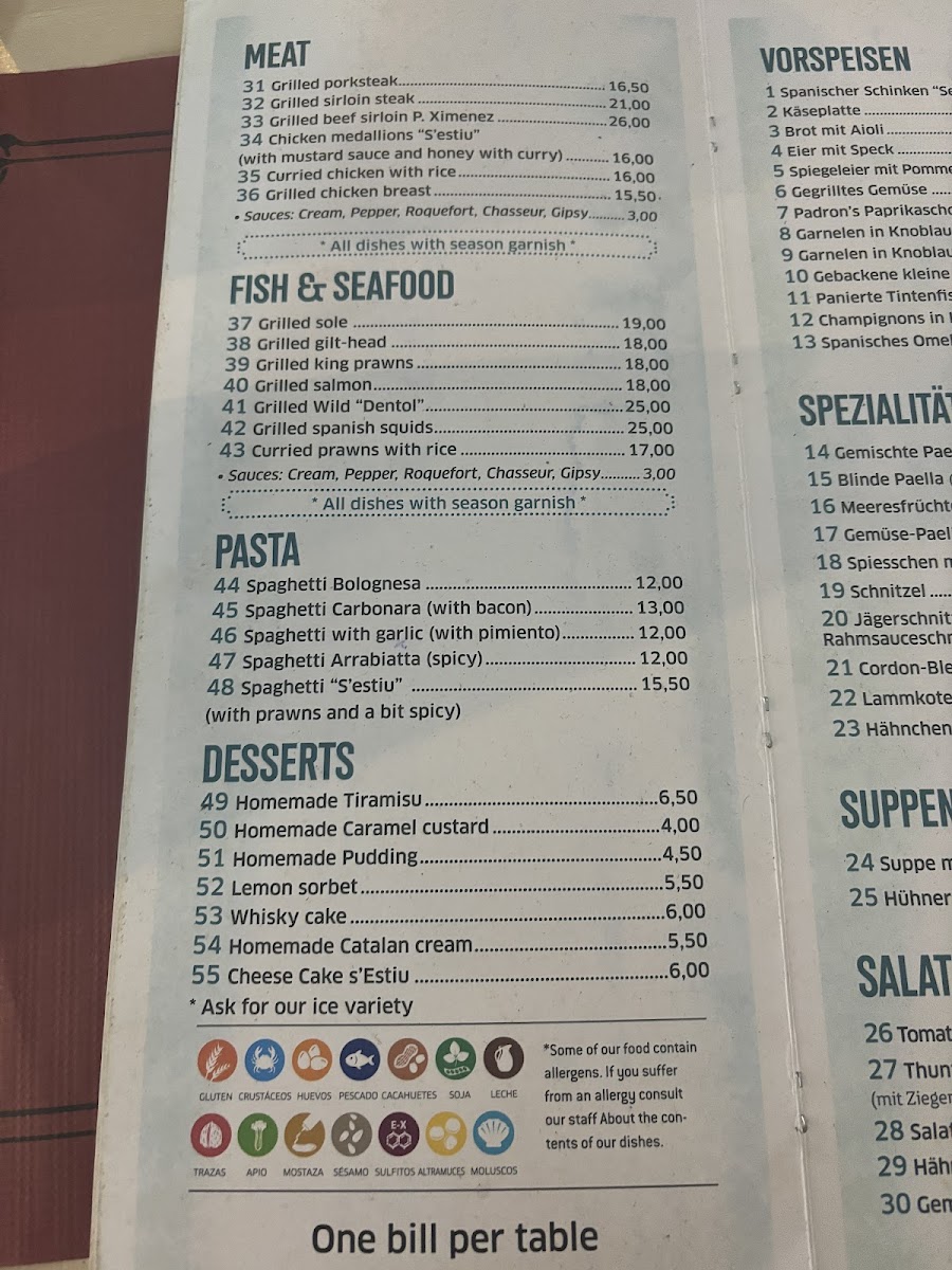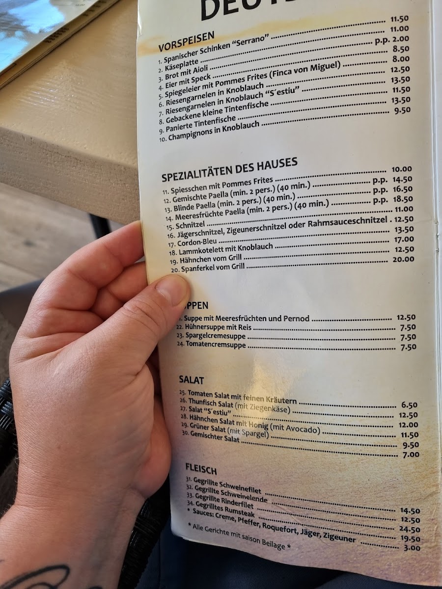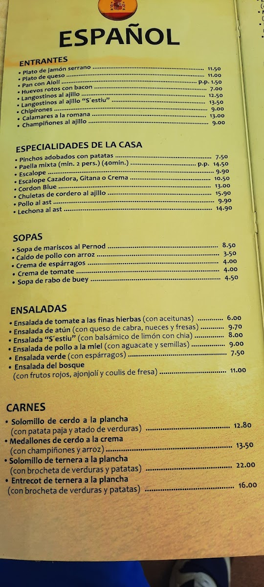 The menu at Restaurant s'Estiu offers a relaxed Mediterranean dining experience with a focus on simple, well-prepared dishes that complement the tranquil coastal setting. You’ll find a variety of options ranging from light salads and fresh seafood like calamari to hearty mains such as lamb chops and paella, ideal for leisurely lunches or evening meals by the sea.
